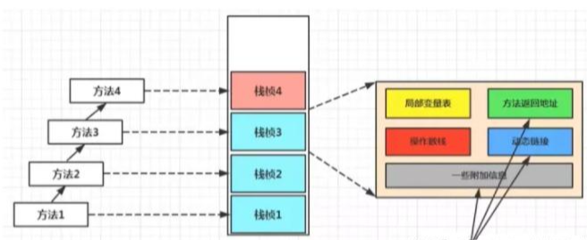 每个 Java 方法在执行的同时都会创建一个栈帧(Stack Frame)用于存储 局部变量表、操作数栈、常量池引用 等信息。每一个方法从调用直至执行完成的过程,就对应着一个栈帧在 Java 虚拟机栈中入栈和出栈的过程。